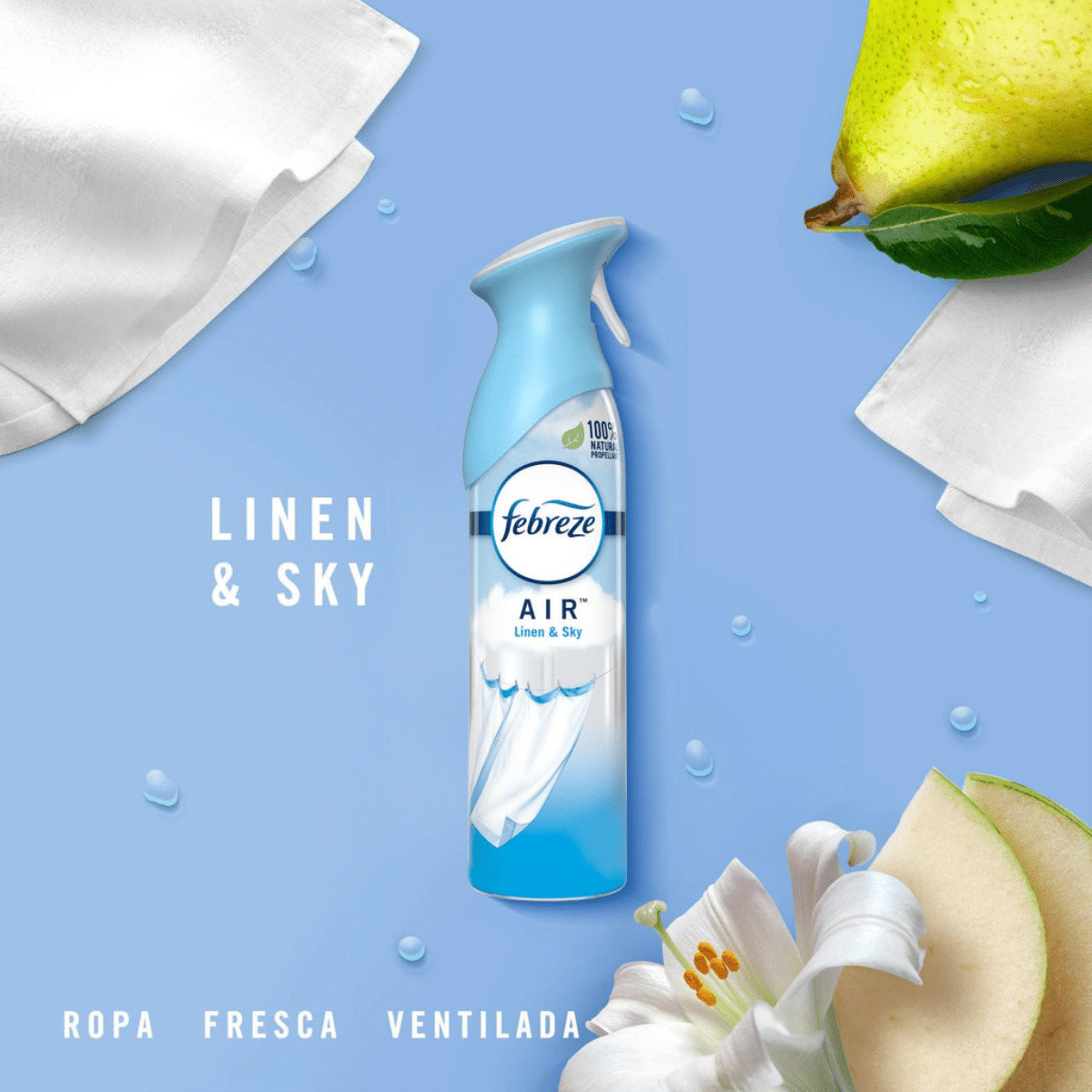 Transforma tu hogar en un oasis de frescura con Febreze Linen & Sky. Elimina olores de manera efectiva, disfruta de una fragancia agradable y revitaliza cualquier espacio con la versatilidad de uso de este aromatizante ambiental. Descubre la frescura instantánea y duradera de Febreze AIR para una experiencia olfativa única en cada aplicación. ¡Dale vida a tu hogar con Febreze!