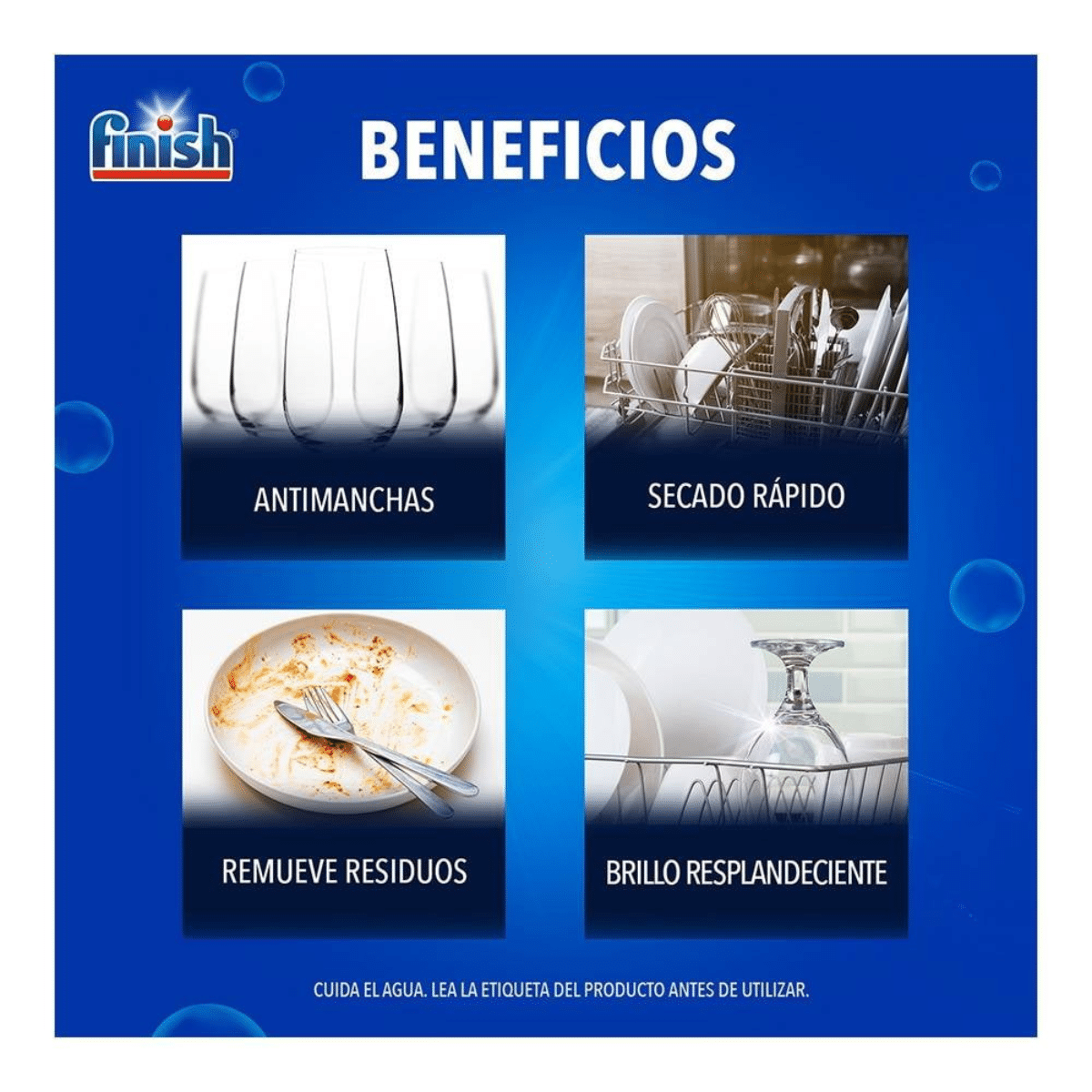 Secado Rápido: Finish Abrillantador cuenta con una fórmula Quick-dry que potencia el proceso de secado durante el ciclo de lavado, asegurando que tu vajilla esté lista para usar en poco tiempo.