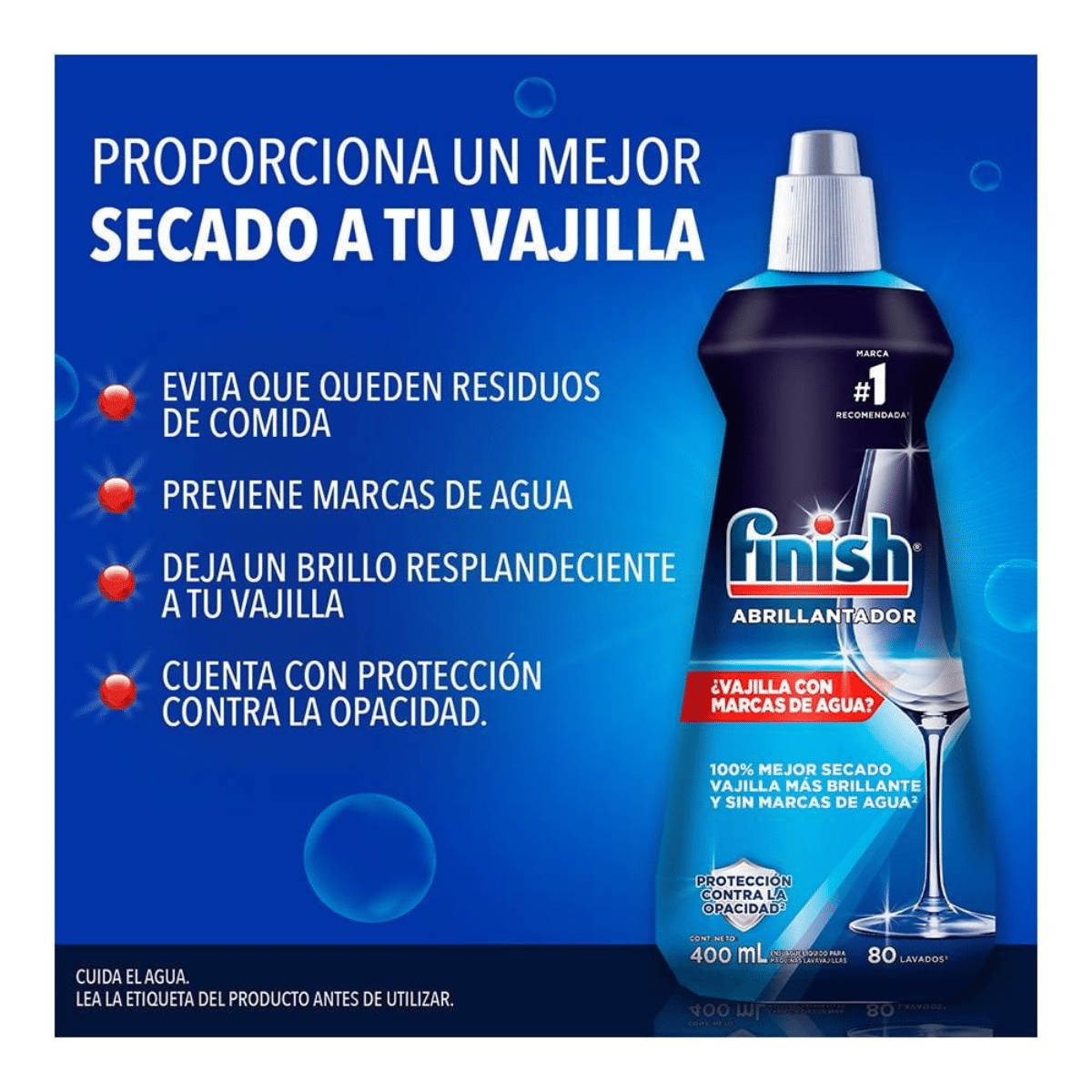 Listo para Usar: Olvídate de tener que esperar a que tu vajilla se seque después del lavado. Con Finish Abrillantador, tu vajilla estará lista para ser guardada o utilizada de inmediato.