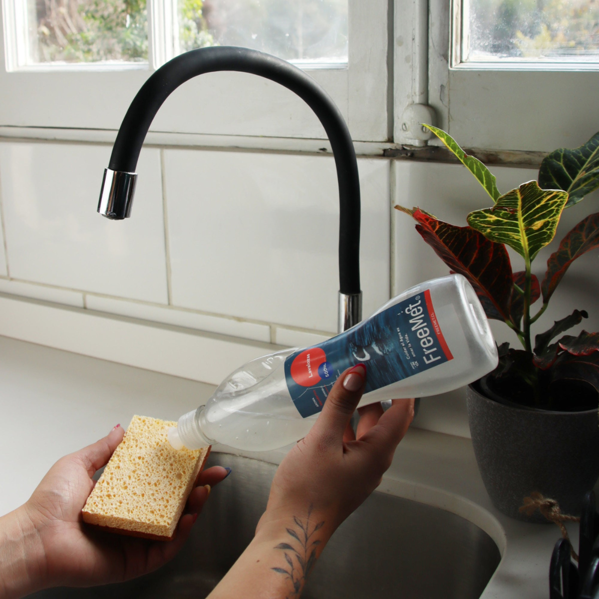 Aplica unas gotas sobre una esponja, lufa o paño y frota suavemente sobre la loza. Para un mejor rendimiento, se recomienda hacer lavazas y evitar el desperdicio de agua al lavar. ¡Cuidemos juntos el planeta! 🌎💙