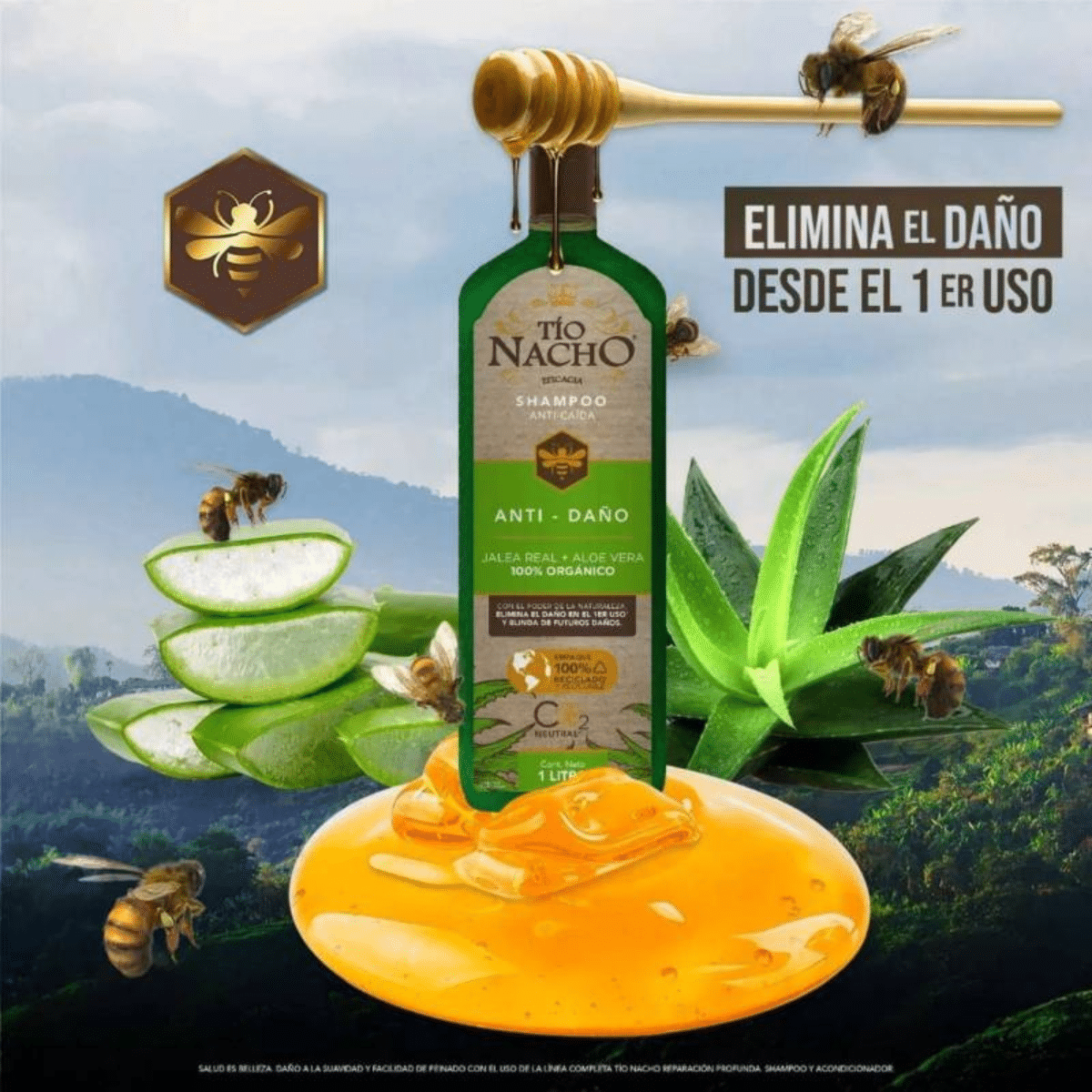 Descubre la revolucionaria fórmula del Shampoo Anticaída Tío Nacho Anti – Daño de 1 litro, parte de la nueva línea Tío Nacho Anti-Daño. Este shampoo ofrece un tratamiento intensivo de reparación para el cabello dañado, desarrollado con extractos potentes de la naturaleza, incluyendo aloe vera 100% orgánico y la valiosa jalea real. Experimenta una reparación profunda desde la raíz hasta las puntas, dejando tu cabello hidratado, suave, manejable y visiblemente más saludable.