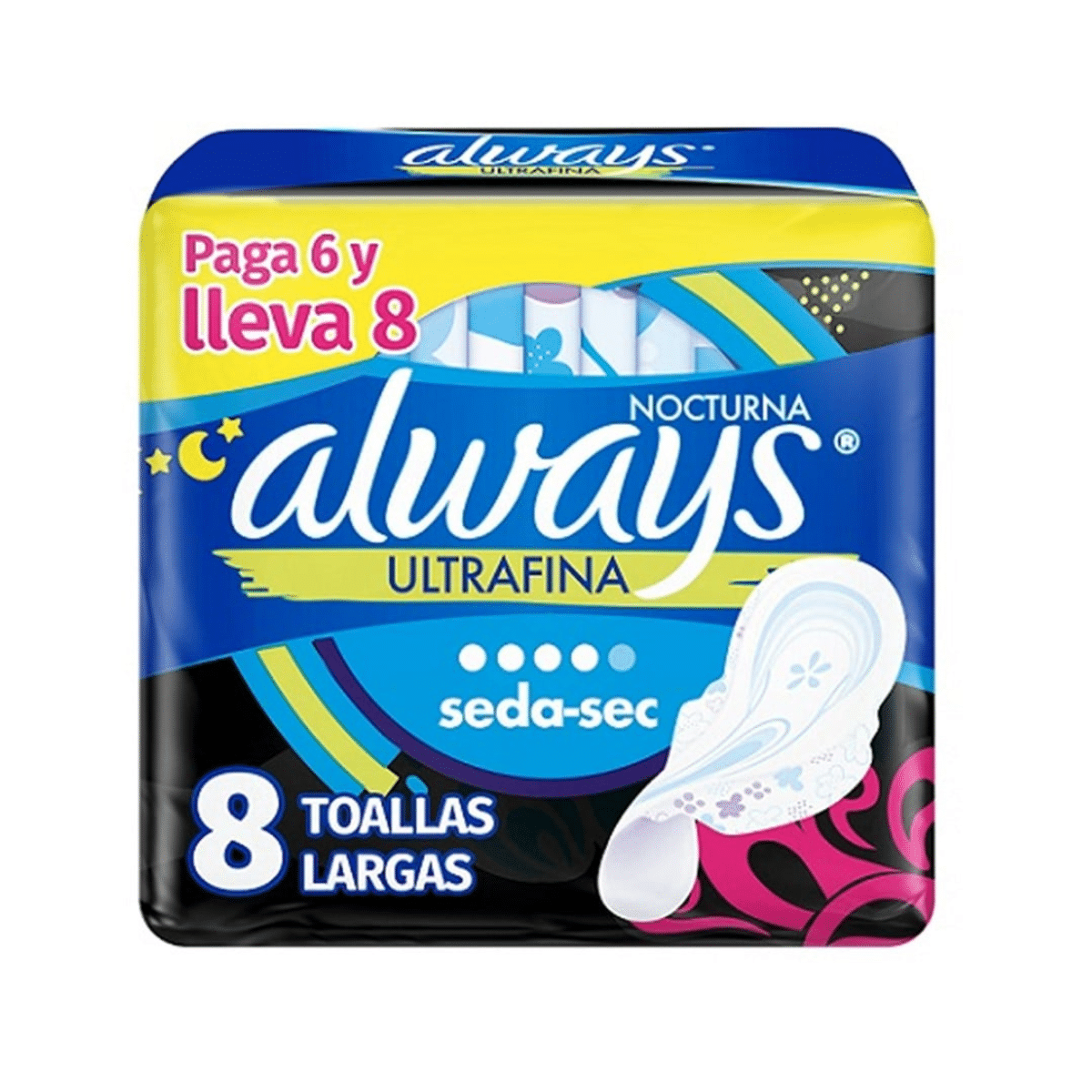 Aprovecha la calidad y la innovación de Always con las Toallas Higiénicas Nocturnas Ultrafinas de 8 unidades. No dejes que esos días te detengan; confía en Always para sentirte segura y protegida en todo momento. ¡Descubre la diferencia que puede hacer Always en tu comodidad y tranquilidad!