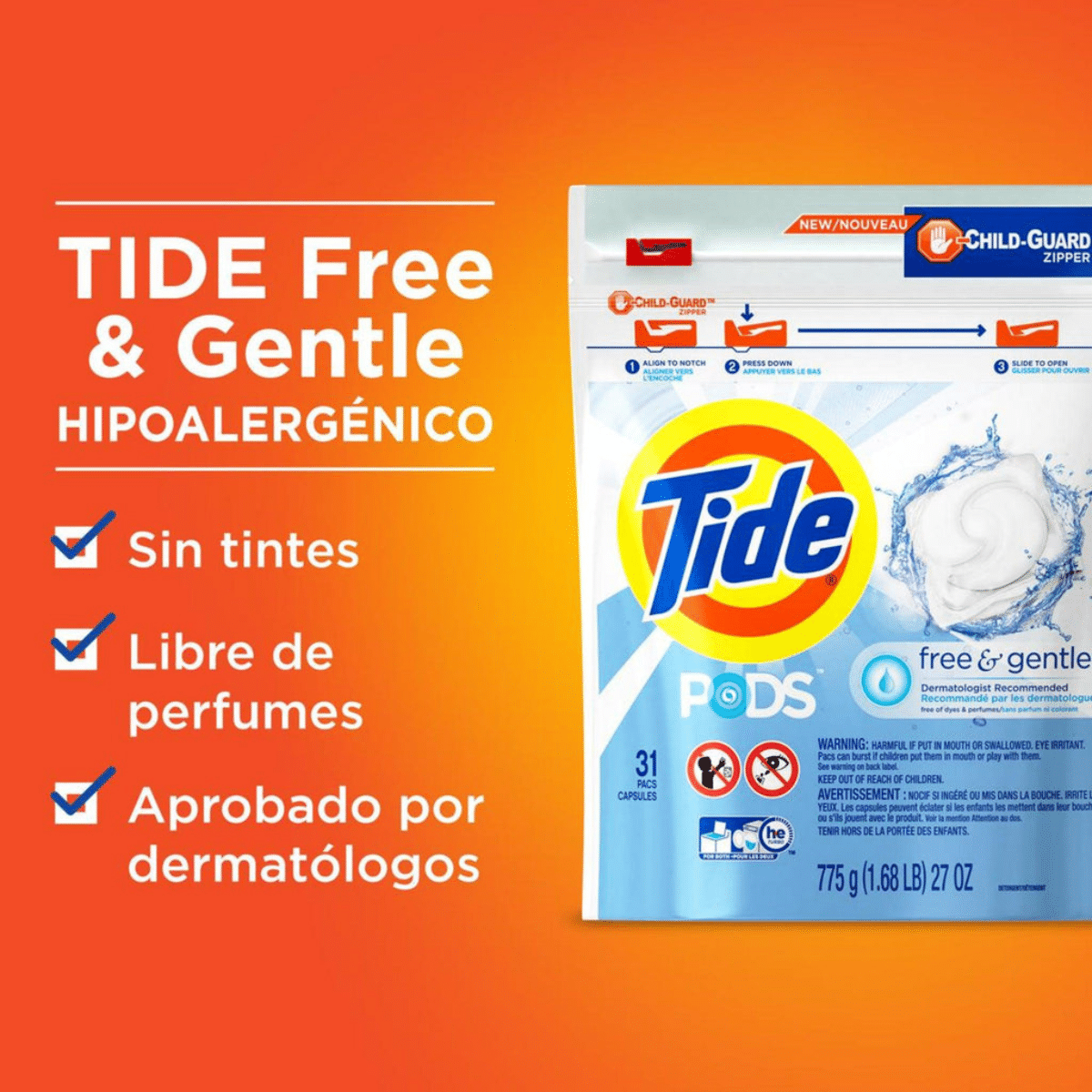 Disfruta de la limpieza avanzada y el cuidado suave que ofrece Tide Free & Gentle.