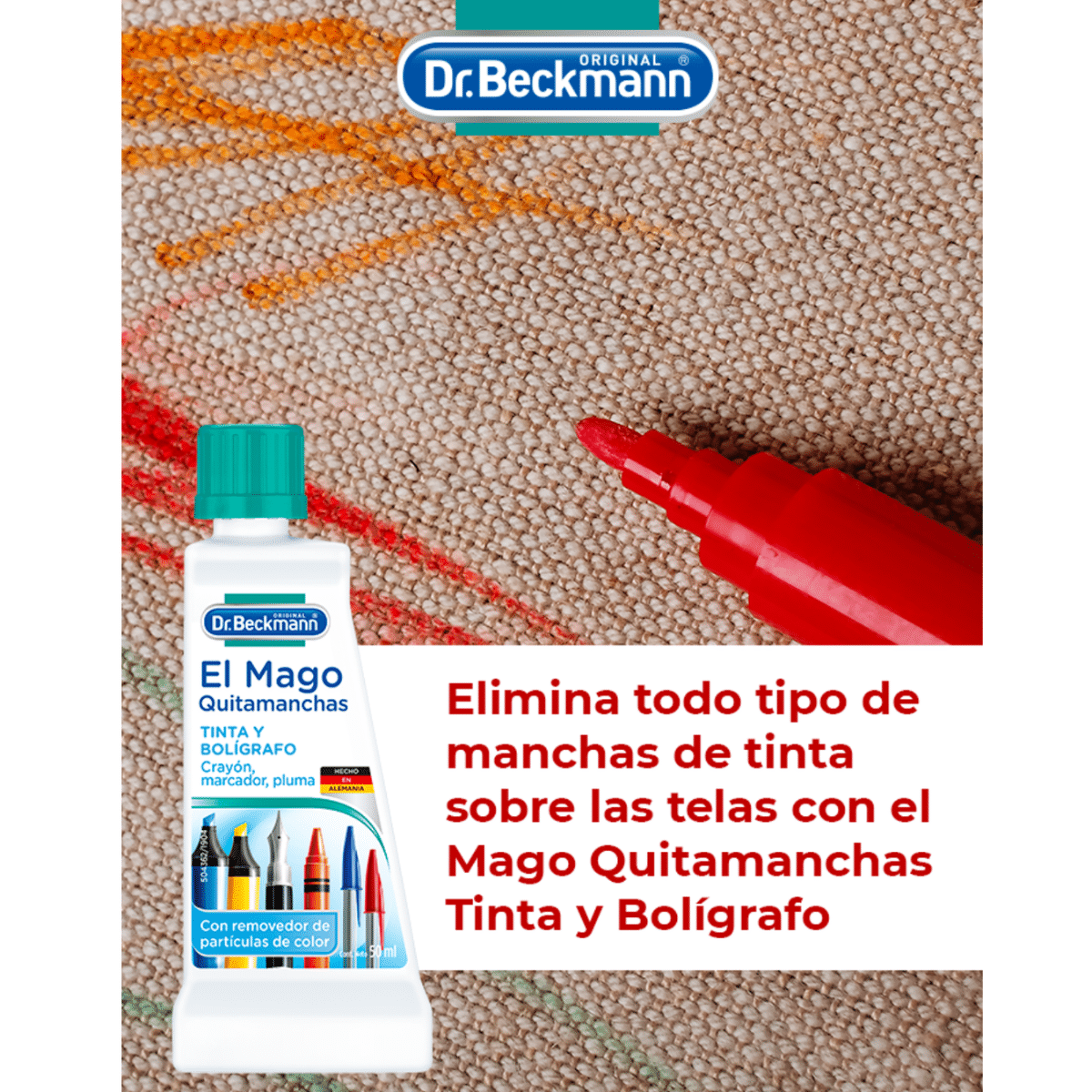 Quitamanchas Dr. Beckmann Tinta y Bolígrafo 50 ml.: Elimina Manchas de Color con Magia Especializada. Descubre la magia en el cuidado de tus prendas con El Mago Quitamanchas Tinta y Bolígrafo Dr. Beckmann 50 ml. Esta fórmula única ha sido diseñada con propiedades especiales para abordar las manchas desafiantes de bolígrafos, lápices y acuarelas. Gracias a un disolvente especializado de partículas de color, este quitamanchas trabaja para disolver los pigmentos y eliminar las manchas sin dejar rastro en tus tejidos favoritos.